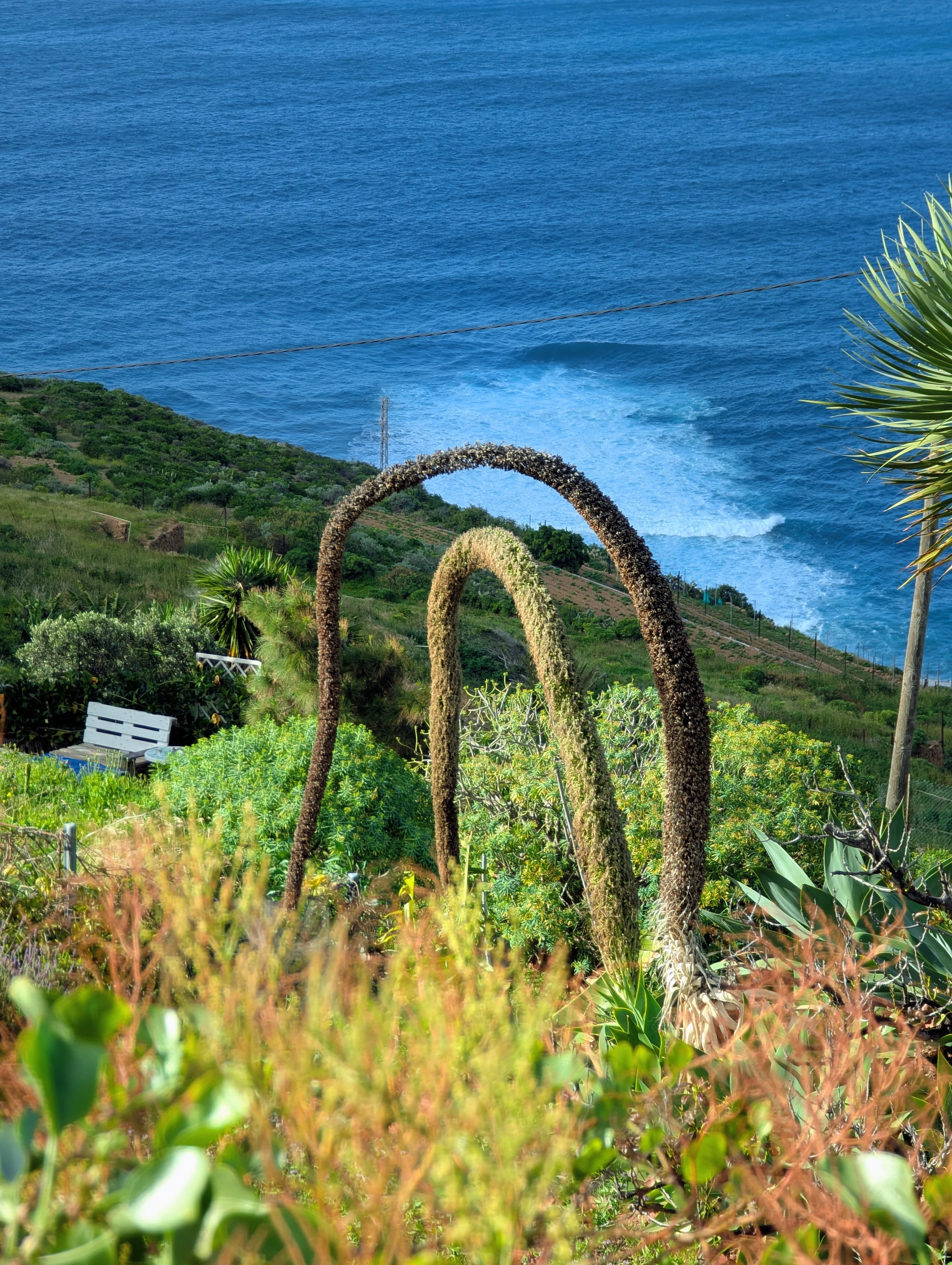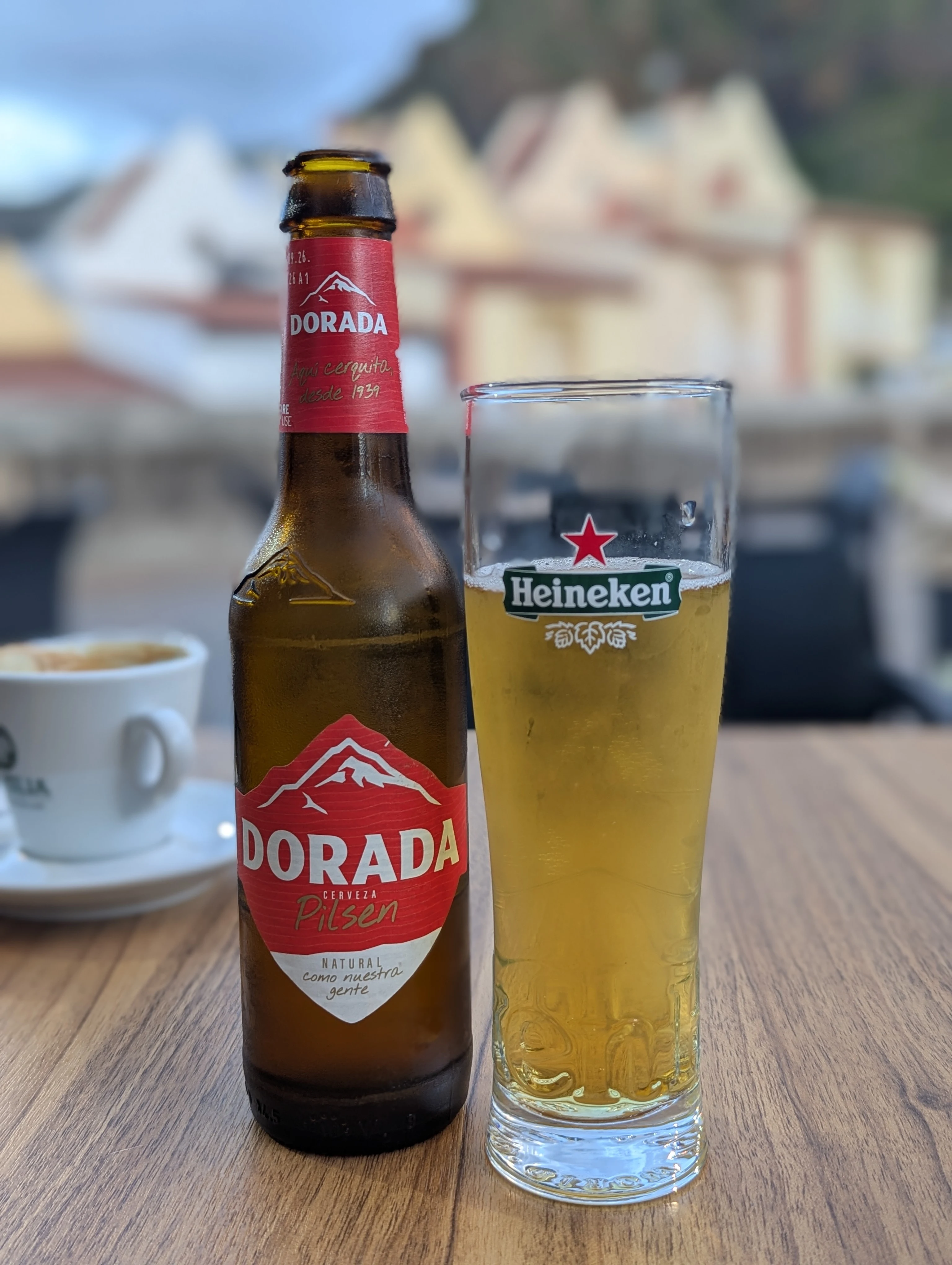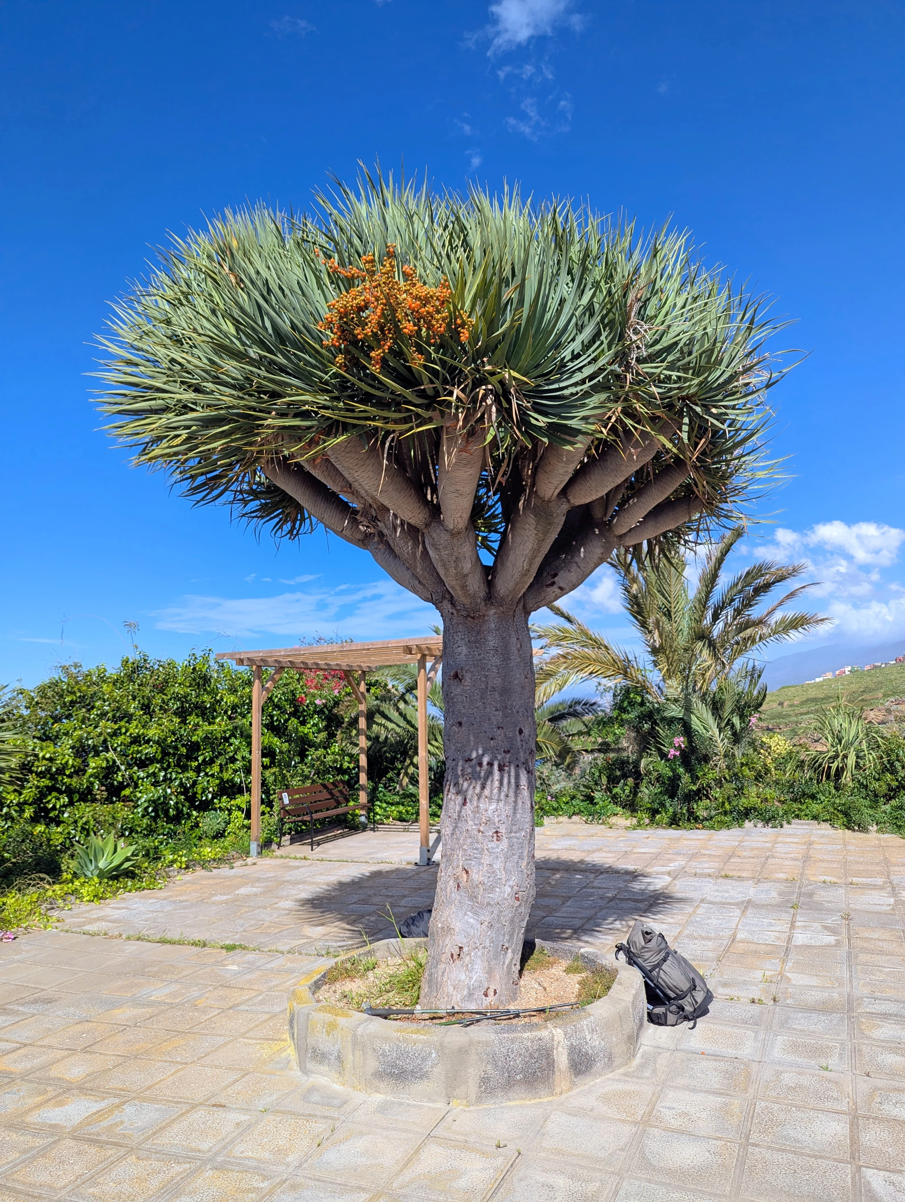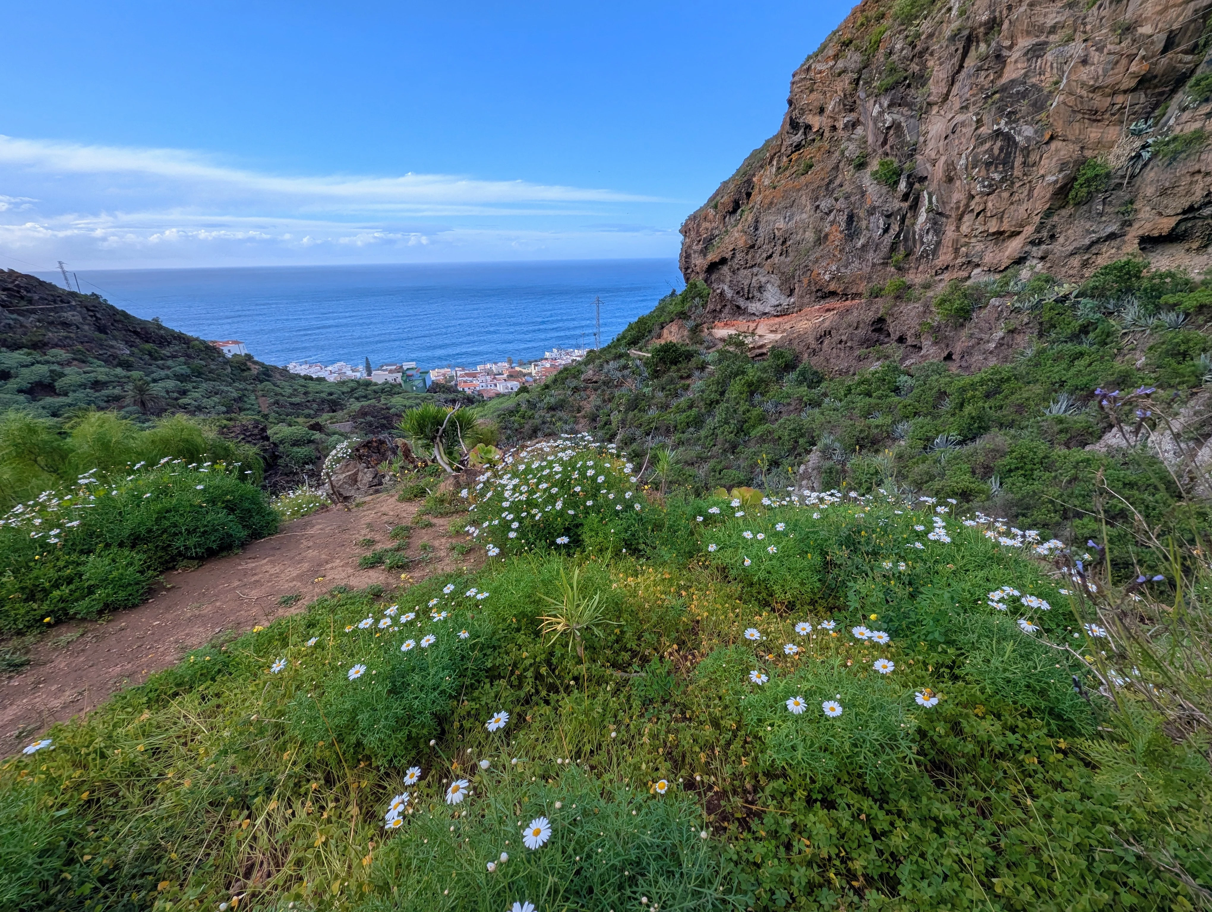 Zuerst einmal geht die Kaffeesonne auf.Die Tour verspricht von allem etwas. Küste, Baranco (Schlucht), Panoramaaussicht und eine kleinen Gipfel für ein Spaßgetränk.Der Aufstieg ist schon schwer.. aber wie so oft lohnt es sich auch.Oben angekommen begrüßt uns eine tolle Sitzgelegenheit mit DrachenbaumUnd ein toller Blick übers LandDieser Mann ist reich.Der Teide ist wie so oft verhüllt.Eine Kanaren BlaumeiseDie Blütenstände der Agave sehen lustig aus. Wie dicke grüne Rüssel.Und die Kumpels sind auch wieder überall zu sehen.Die Kakteen blühen auchDer Abstieg zurück ins Tal führt uns durch eine wunderschöne Blumenwiese. Überall summt und brummt es.Der Seeadler kreist und wird vom Falken geärgert.Es ist wie immer einfach traumhaft schön die kleinen Vögelchen zu verfolgen. Mit dem überschreiten des 30igsten Lebensjahres, kauft man sich entweder ein Gravelbike, eine Siebträgerkaffeemaschine oder man findet Vögel cool.Im Ort angekommen eroffnen sich kleine Gässchen und Wege mit ebenso kleinen Türchen.Die Kirchenfenster wurde neu gestaltetDanach direkt erstmal ein Bier.Auf dem Rückweg wird es dunkel. Wie fast auf jedem Rückweg..Auch das ist Urlaub!