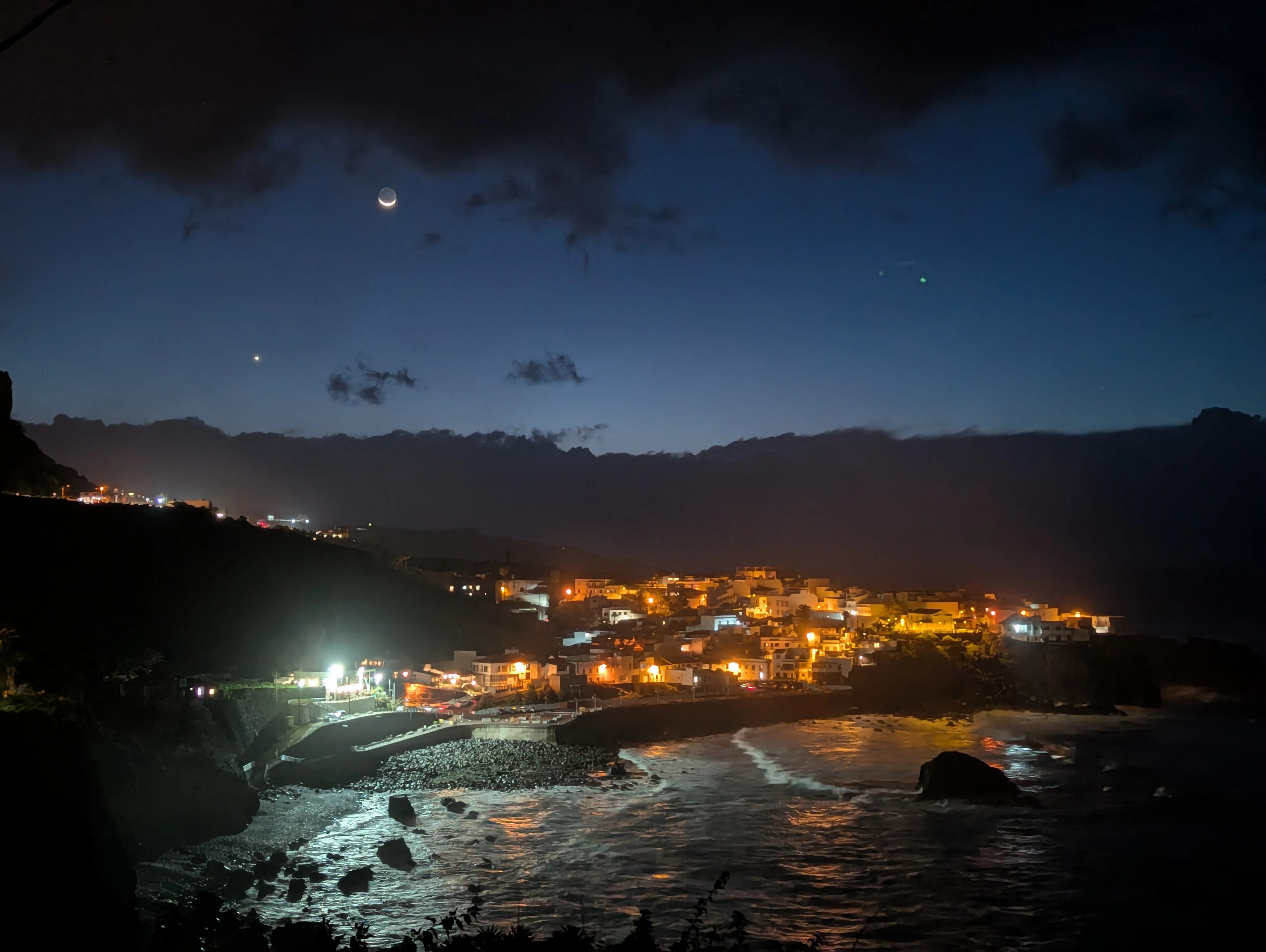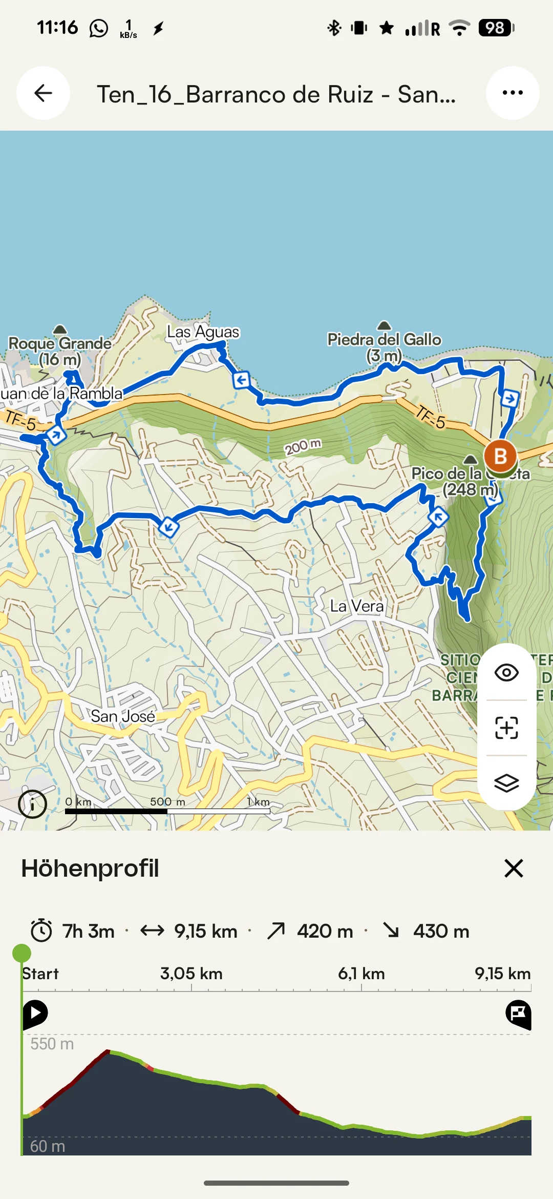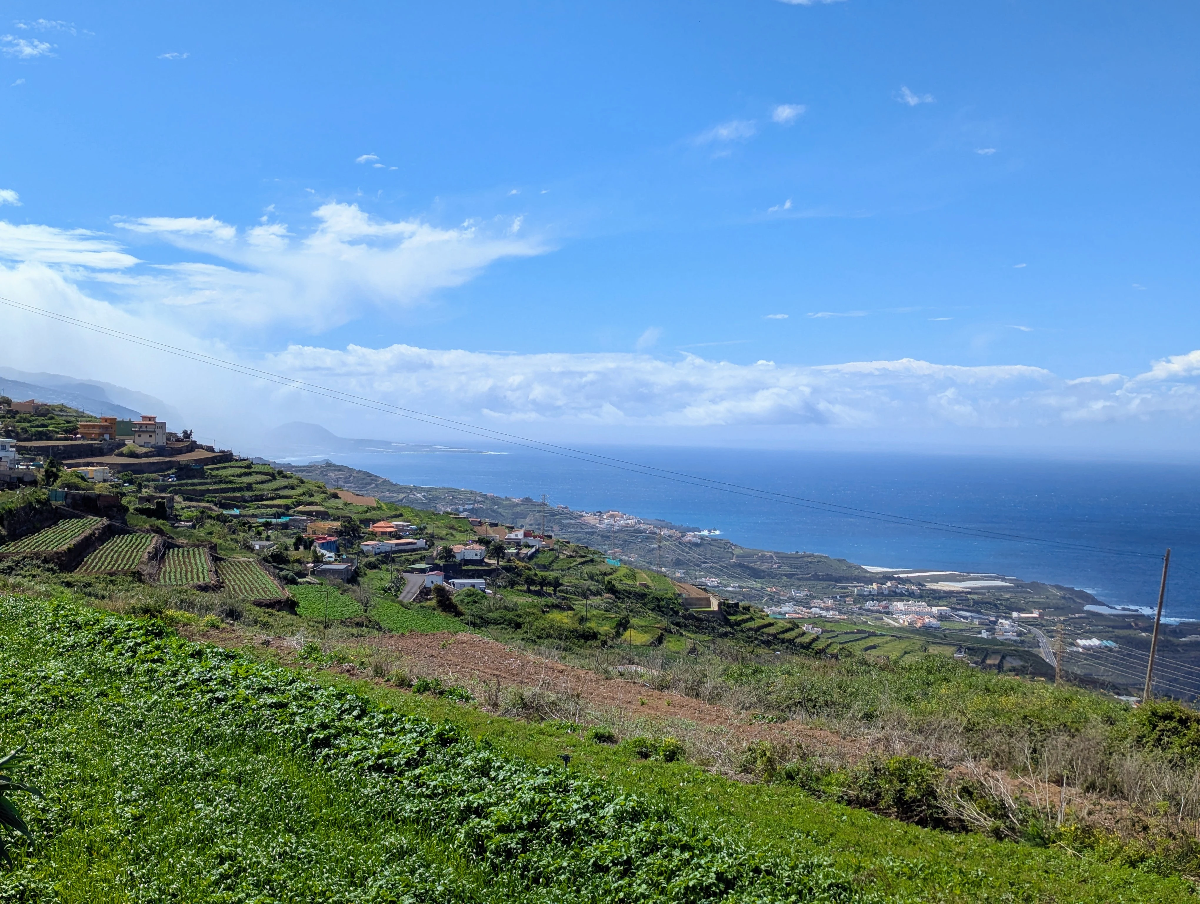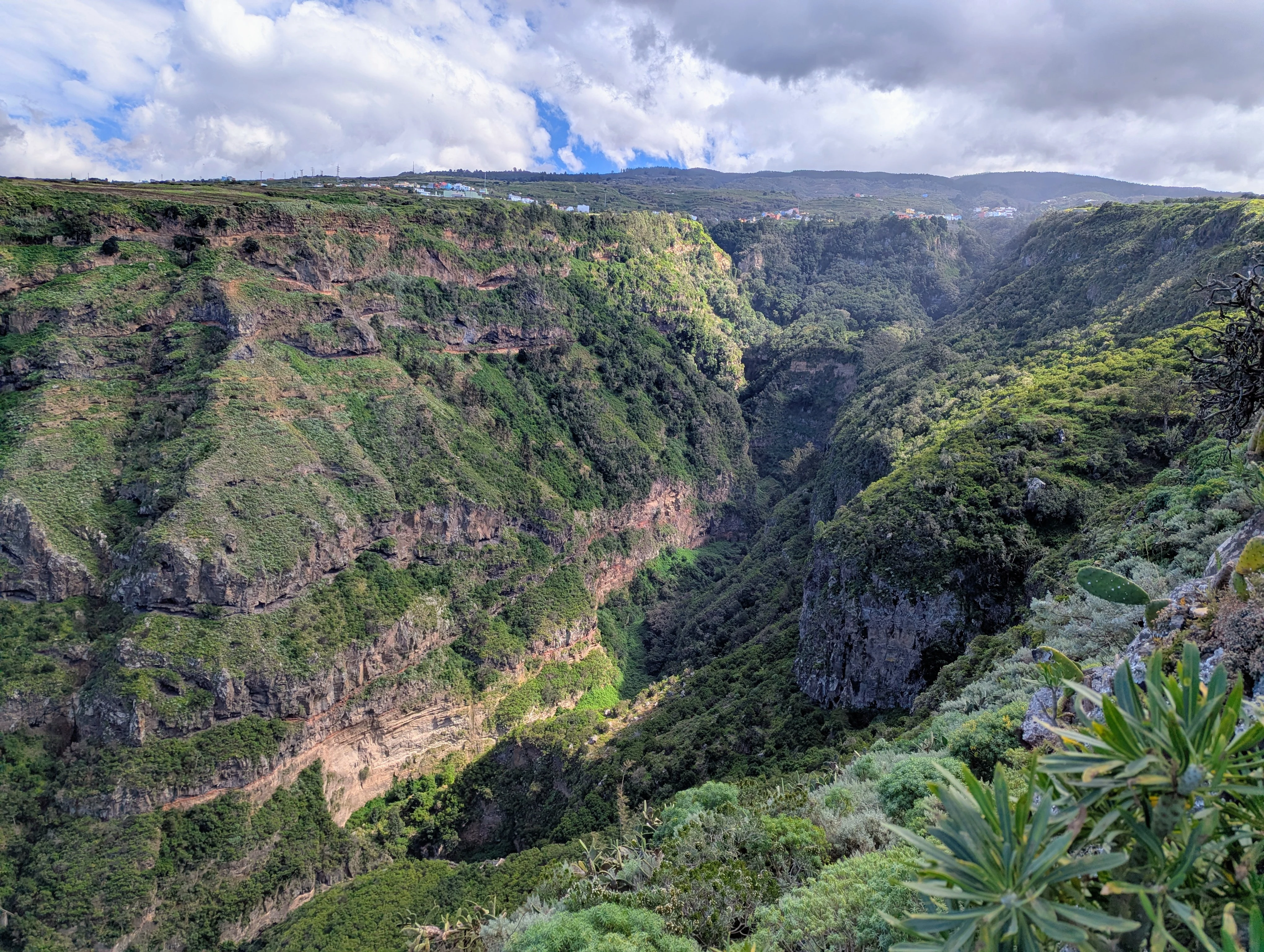 Zuerst einmal geht die Kaffeesonne auf.Die Tour verspricht von allem etwas. Küste, Baranco (Schlucht), Panoramaaussicht und eine kleinen Gipfel für ein Spaßgetränk.Der Aufstieg ist schon schwer.. aber wie so oft lohnt es sich auch.Oben angekommen begrüßt uns eine tolle Sitzgelegenheit mit DrachenbaumUnd ein toller Blick übers LandDieser Mann ist reich.Der Teide ist wie so oft verhüllt.Eine Kanaren BlaumeiseDie Blütenstände der Agave sehen lustig aus. Wie dicke grüne Rüssel.Und die Kumpels sind auch wieder überall zu sehen.Die Kakteen blühen auchDer Abstieg zurück ins Tal führt uns durch eine wunderschöne Blumenwiese. Überall summt und brummt es.Der Seeadler kreist und wird vom Falken geärgert.Es ist wie immer einfach traumhaft schön die kleinen Vögelchen zu verfolgen. Mit dem überschreiten des 30igsten Lebensjahres, kauft man sich entweder ein Gravelbike, eine Siebträgerkaffeemaschine oder man findet Vögel cool.Im Ort angekommen eroffnen sich kleine Gässchen und Wege mit ebenso kleinen Türchen.Die Kirchenfenster wurde neu gestaltetDanach direkt erstmal ein Bier.Auf dem Rückweg wird es dunkel. Wie fast auf jedem Rückweg..Auch das ist Urlaub!
