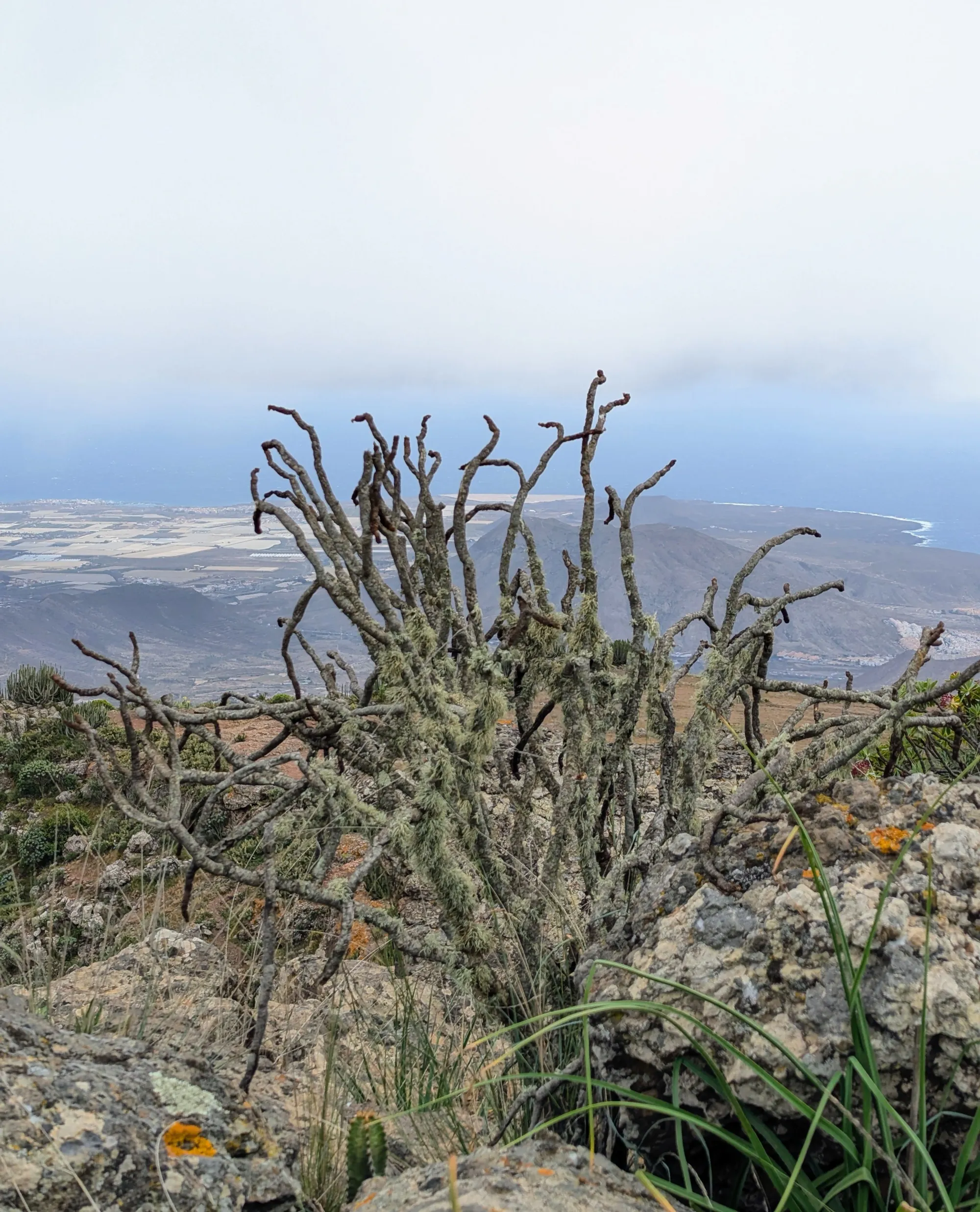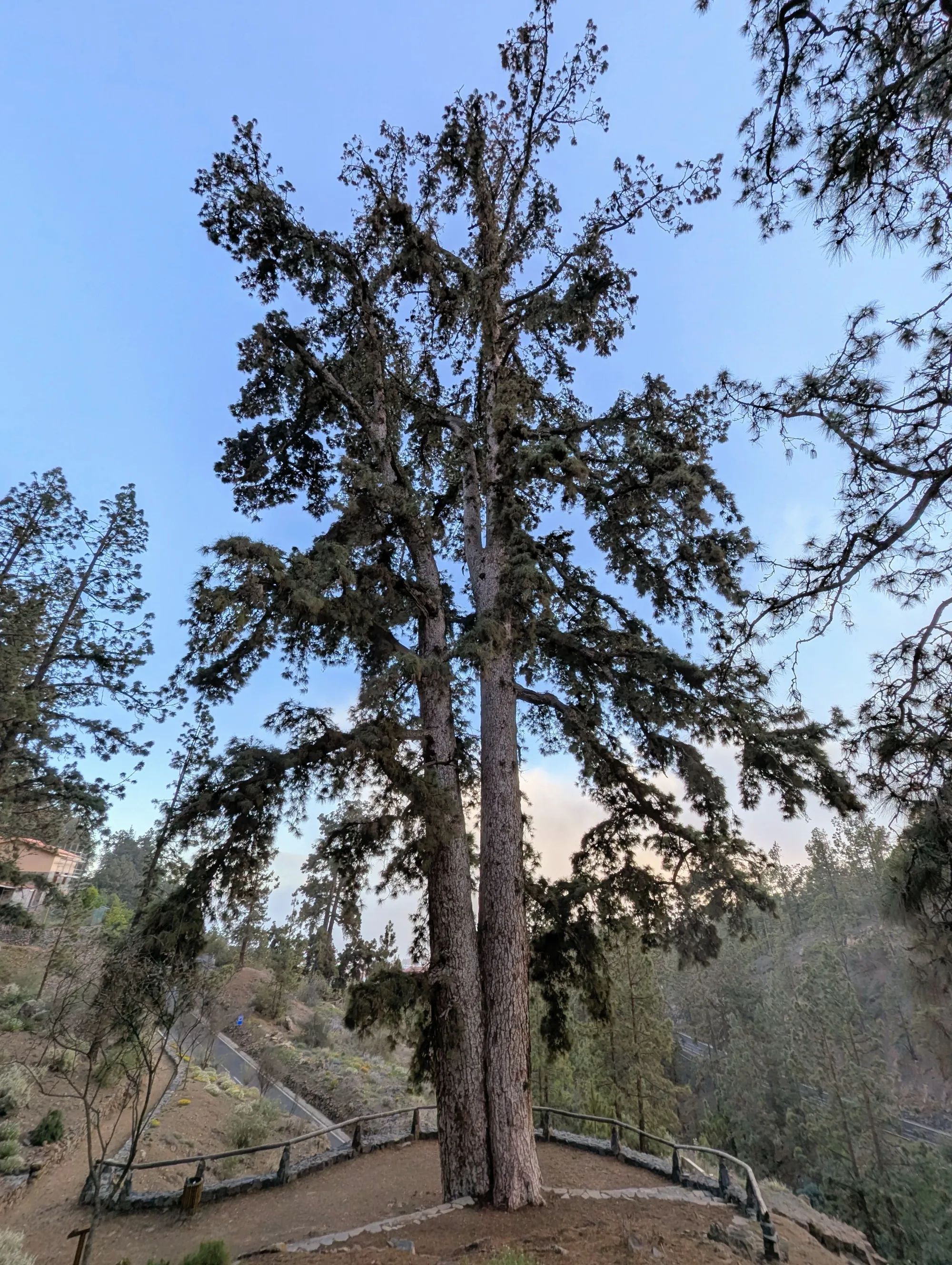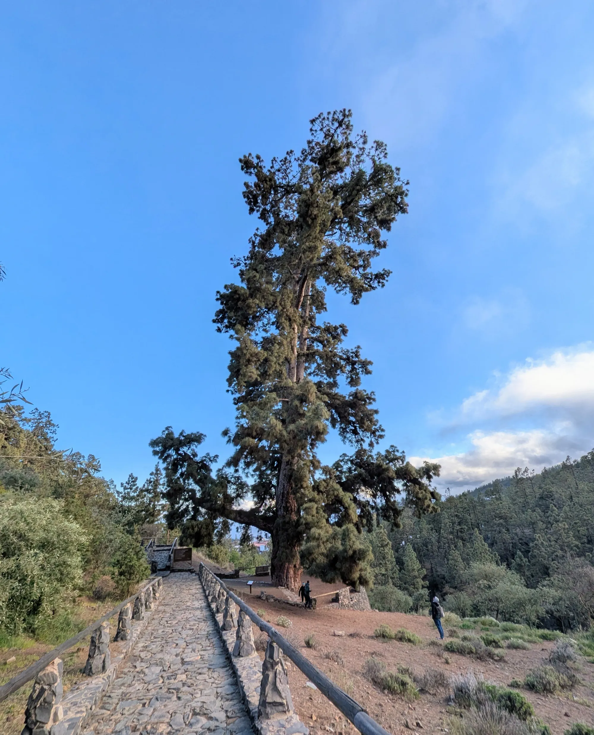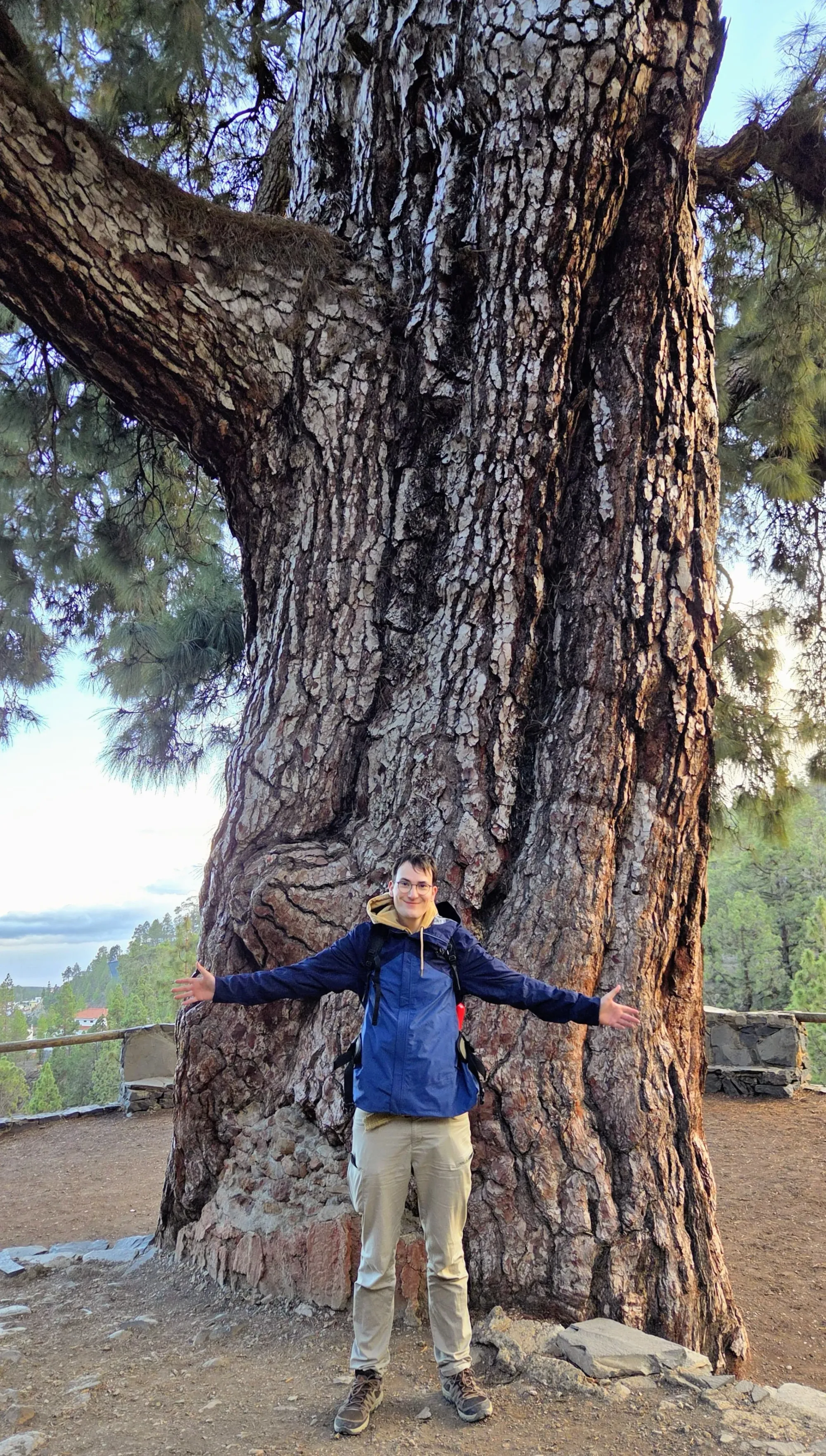 Ohne Frühstück geht nix. Da Unwetter Theresa für Sperrungen der Wege sorgt, wurde unser Tagesziel abgesagt. Aber es gibt kaum etwas, was ein frischer Orangensaft und ein Croissant nicht wieder richten können.Kurz entschlossen entscheiden wir uns für eine andere AufwärmtourDer Schicksalsberg begleitet uns die ganze Zeit, ist aber nicht unser Ziel. Wir haben aber den Ring nicht dabei.Mal läuft der Weg gerade, dann ist Freude angesagt..Manchmal ist es aber auch einfach nur sehr schwer. Der Ausblick auf einen Gipftel-Snack macht müde Männer munter.Sprühregen und Sonne wechseln sich ab, es geht kräftiger Wind.Roter und Bauer Anorak, man erkennt die Deutschen.Der ist als nächstes Abenteuer schon gesetzt.Der kleine Canyon mit seinen unzähligen Höhlen ist Lebensraum von Eidechsen und Felstauben.Die Sonne steht tief und wir haben HungerWir fahren nach Vilafior, der hächet gelegenen Stadt Teneriffas auf 1400m. Im Vorgarten der Kirche wächst die landestypische Rote Tanaste. Weil wir so fröhlich darüber sind sie blühend zu sehen erklärt uns eine Einheimisch, dass aus den Pollen ein spezieller Honig gemacht wird.Bevor die Sonne untergeht besuchen wir noch zwei Superlative. Spaniens dickster Baum, 9.3m Umfang, 3.16m Durchmesser. Und auch noch der dritt höchste. Er steht schon seit über 800 Jahren und ist einfach mächtig gewaltig.Er bietet Lebensraum für viele Spechte.Ganz schön dickes Ding.Auf zum höchsten Baum Spaniena, 600 Jahre alt und 58m hoch, 100m vom dicksten Beum entfernt. Jetzt aber schnell was essen gehen, sonst kippen wir aus den Latschen